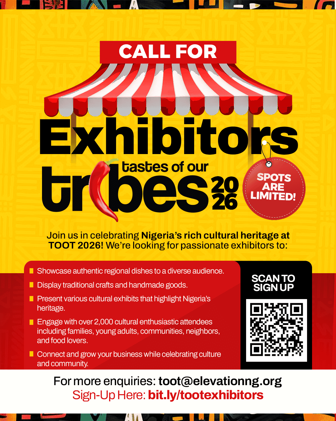 Join us as a vendor at Tastes Of Our Tribes (TOOT) and showcase your products to a diverse audience! Don’t miss this chance to be part of our exciting Easter Monday extravaganza. Contact us now to secure your spot!